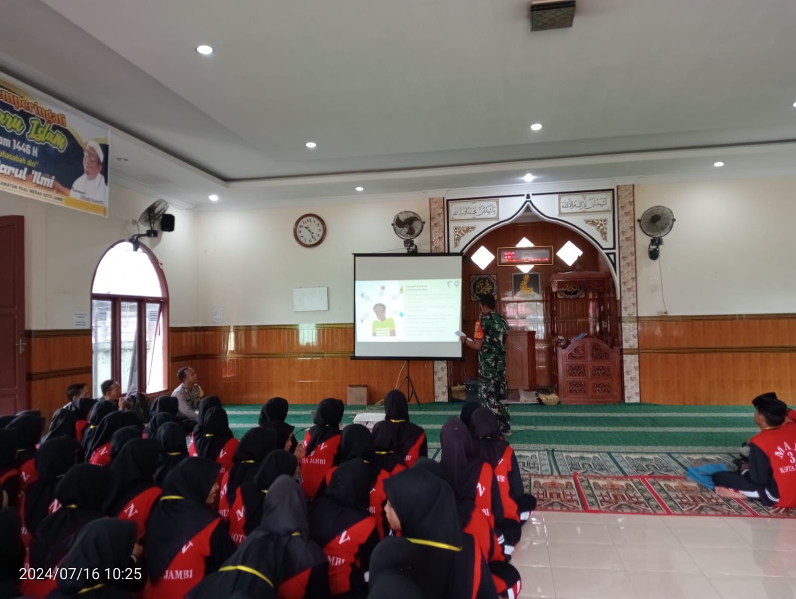 Setelah senam berakhir, siswa dikumpulkan kembali di tengah lapangan. Mereka pun berbaris dengan rapi. Anggota OSIM dengan cekatan mengarahkan siswa agar mengikuti setiap instruksi. Sementara itu Babinkamtibmas dan Babinsa Kelurahan Eka Jaya Polsek Jambi Selatan dengan seragam lengkap sudah siap memberikan materi kepada siswa baru. Sejenak para siswa terpukau dengan anggota tersebut yang tampil dengan penuh kharisma dan wibawa. Dalam sekejap mereka telah mendapat tempat di hati para peserta MATSAMA. Karena tidak sedikit yang bercita-cita ingin menjadi aparat negara. Salah satu materi yang disampaikan ialah mengenai pentingnya latihan baris berbaris di lingkungan madrasah. Karena manfaat mengikuti LKBB untuk melatih fisik, kedisiplinan, kekompakan dalam tim, loyalitas, rasa persatuan, kepedulian antar sesama serta memiliki rasa tanggung jawab sehingga akan menjalankan setiap kegiatan dengan sungguh-sungguh.